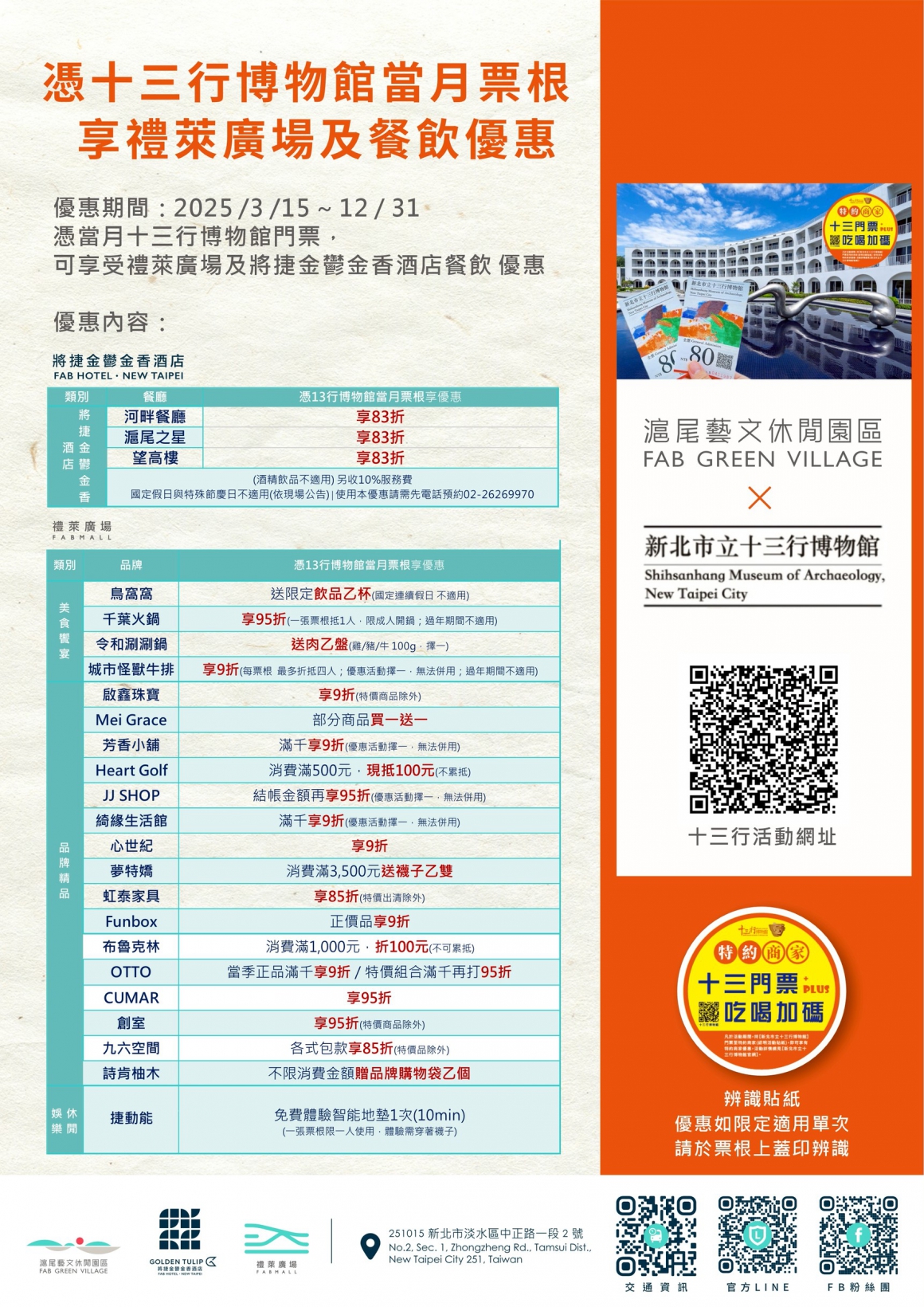 憑十三行博物館當月票根享禮萊廣場及餐飲優惠