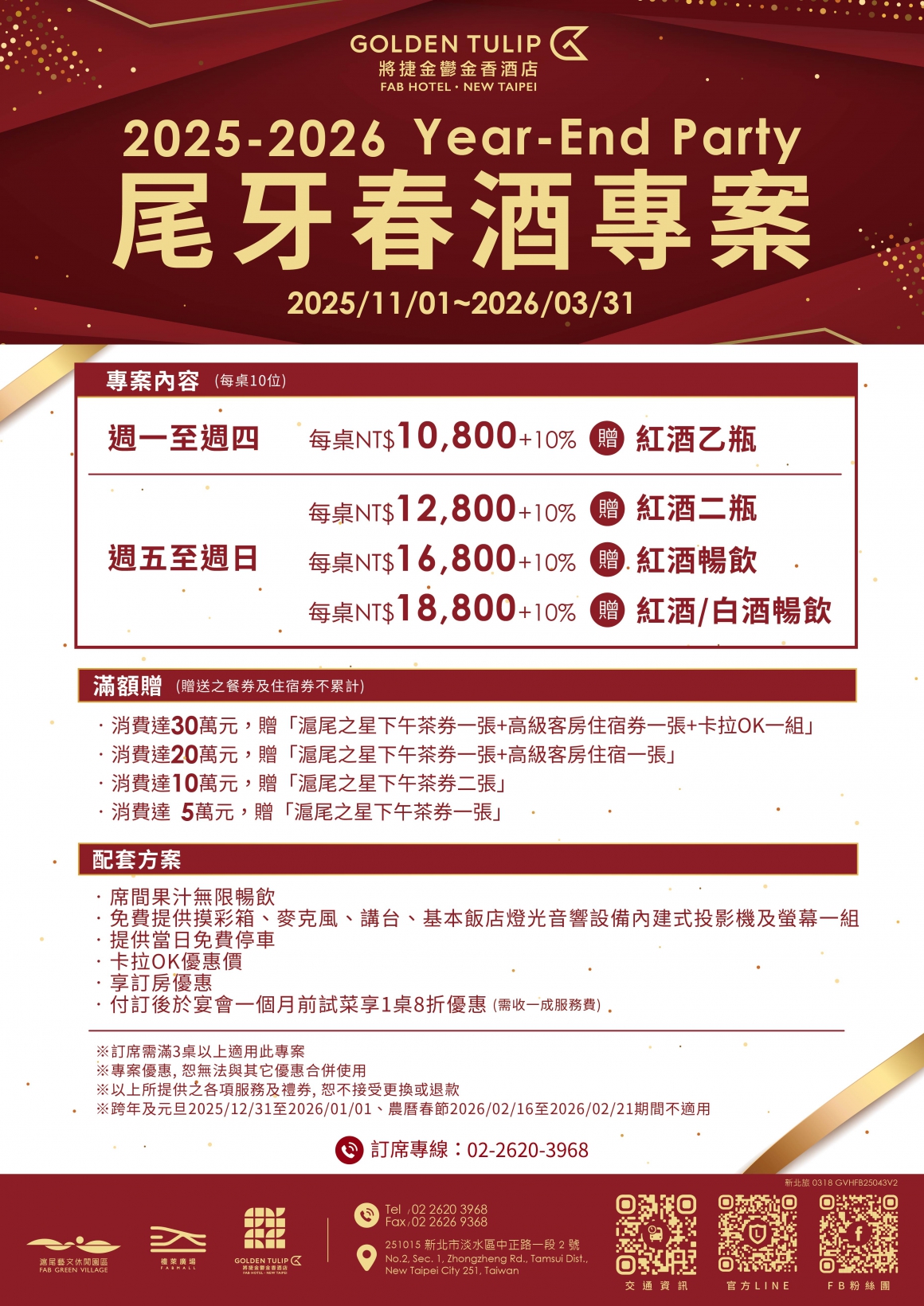 - 消費達 30 萬元,贈「滬尾之星下午茶券一張+高級客房住宿券一張+卡拉OK一組」