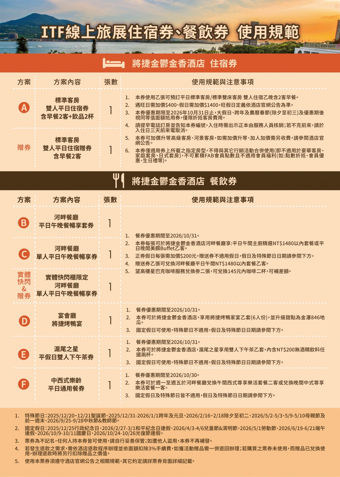 - 本券優惠期限至 2026年10月31日止,大假日、跨年及農曆春節(除夕至初三)及優惠期後視同等值面額抵用券,僅限折抵客房費用。