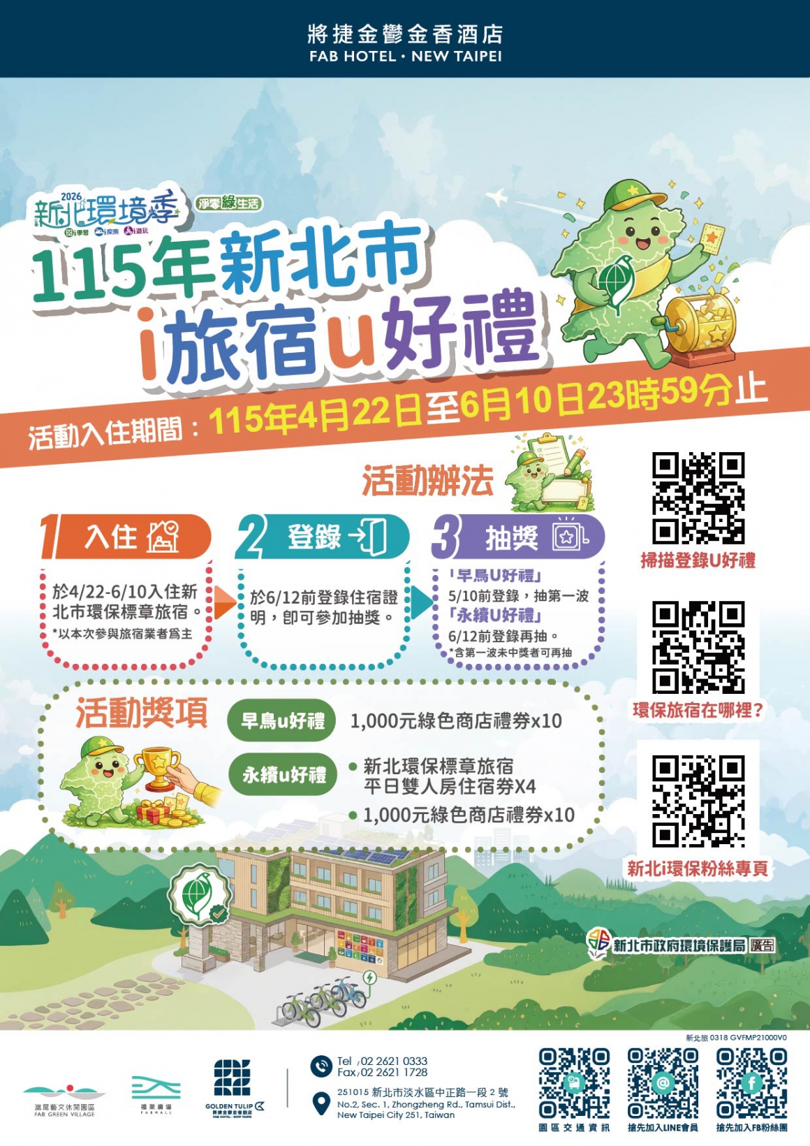 - 入住:於4/22~6/10入住新北市環保標章旅宿。